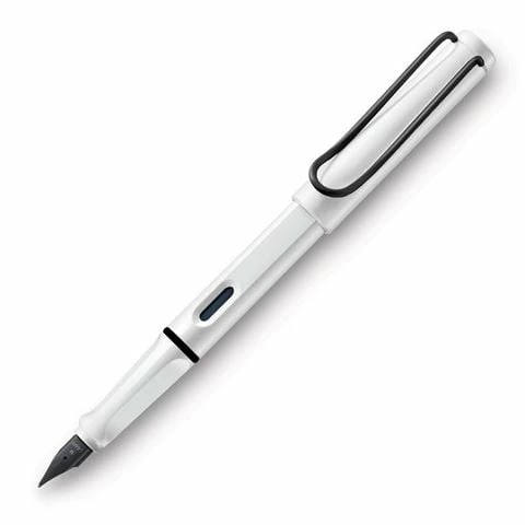 This Special Edition Safari Fountain Pen in white with a chic black trim, is inspired by the 90s and gives an old school look to the celebrated pen design. Itโs easy to grip, thanks to the distinctive recessed grips and itโs made from robust durable material with a large ink cartridge T 10 blue, prepared for converter Z 28. Let the words flow from that medium nib.